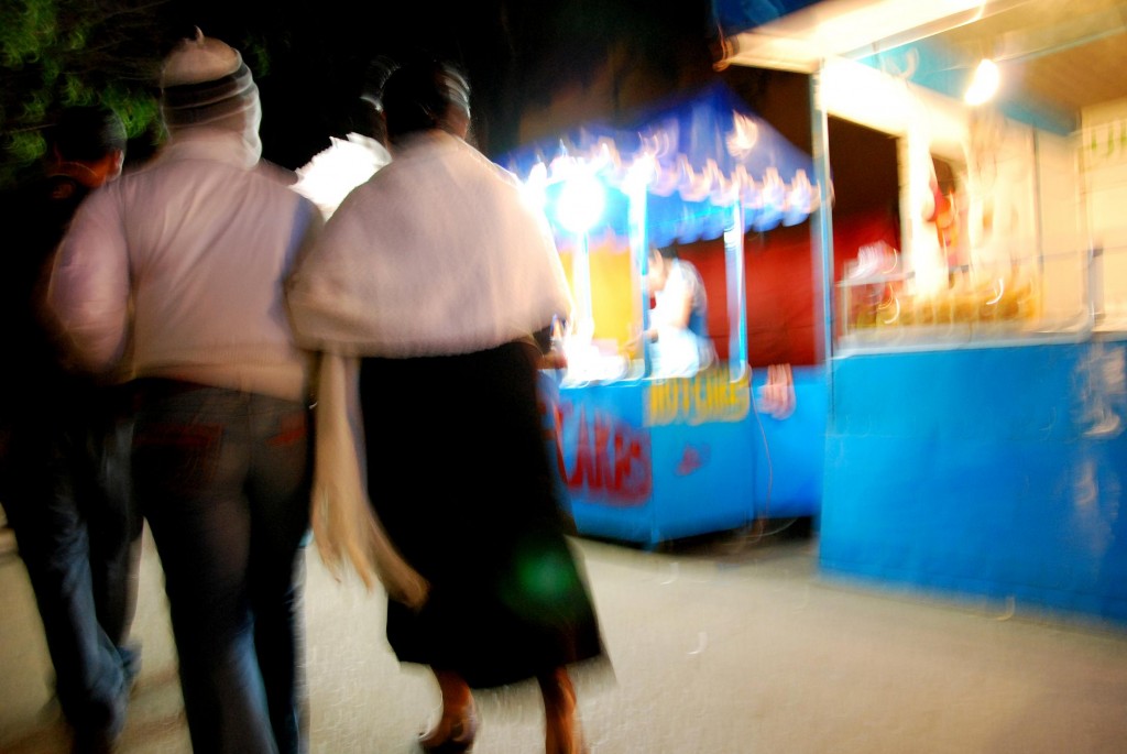 Mother and daughter walk past fair vendors in Oaxaca, Mexico during the Dia de Los Muertos (Day of the Dead) celebrations in the city.
