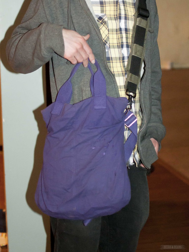 I bought the purple bag at Walmart for $7. Yup, that’s right only 7 bucks. This little bad boy holds all of the same gear as the Army Navy Bag. It’s a great, simple bag; though, I had to make some minor adjustments in order to use it for my photo gear. I’m going to give a run down of what I did to it so that you can do the same if you wish.
