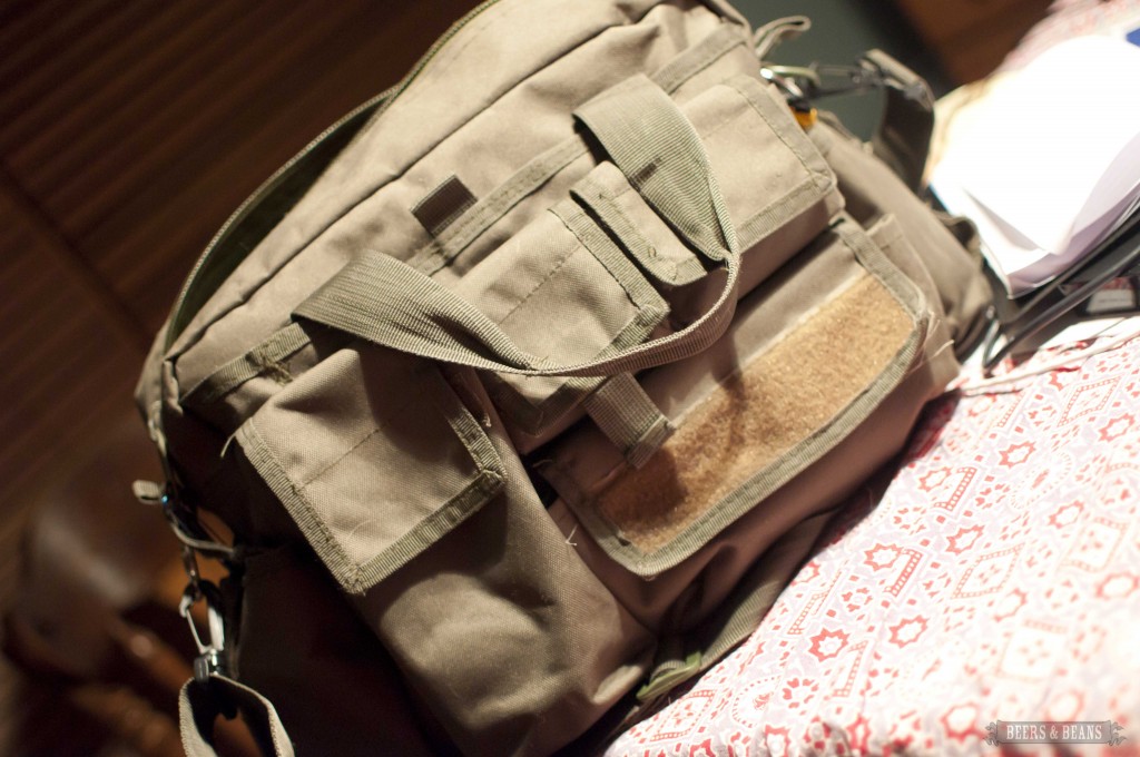 At long last, I thought I found the perfect bag when I found this gem at an Army Navy store for only $27. It has several pockets and even two on the ends (I used one for my water bottle and and for my beer cozy loupe)! To top it off it was already lined with a plush padding similar to a real camera bag. I have no idea why but it’s perfect! And it actually came with a removable insert that I could use to separate items. To top it off the entire inside is made of velco (the soft side of velcro), which means I can actually arrange camera bag inserts into it if I want and they stay in place. It fits all my travel gear (Nikon D300s w/ 18-250 lens, 35mm lens, SB900 flash, various filters, cards, batteries) and it’s made out of a super tough canvas. It also looks cool. I love this bag and for $27 you can’t go wrong.