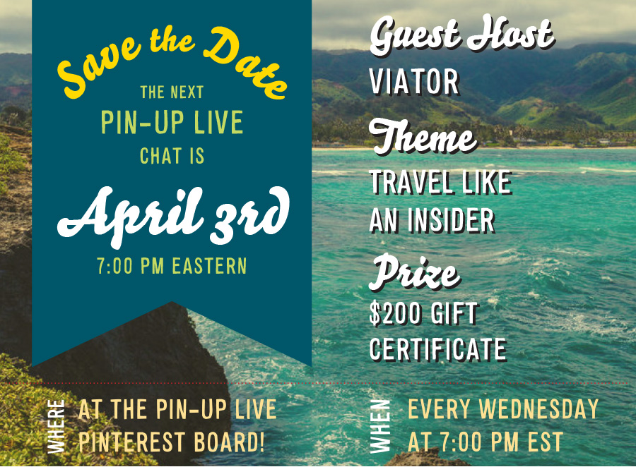 Join us this Wednesday (4/3) at 7 p.m. (EST) to have a real time chat about traveling like an insider with a healthy dose of Pinspiration! It’s simple to participate, just head on over to our Pinterest board, Pin Up Live, which is dedicated to the event. We will be pinning inspirational travel pins to the board, each one containing a question about Insider Travel. All you have to do is be on the board! We’ll be hosting the event with our special guest Viator, who will be sharing tips about traveling like an insider throughout the hour-long chat.