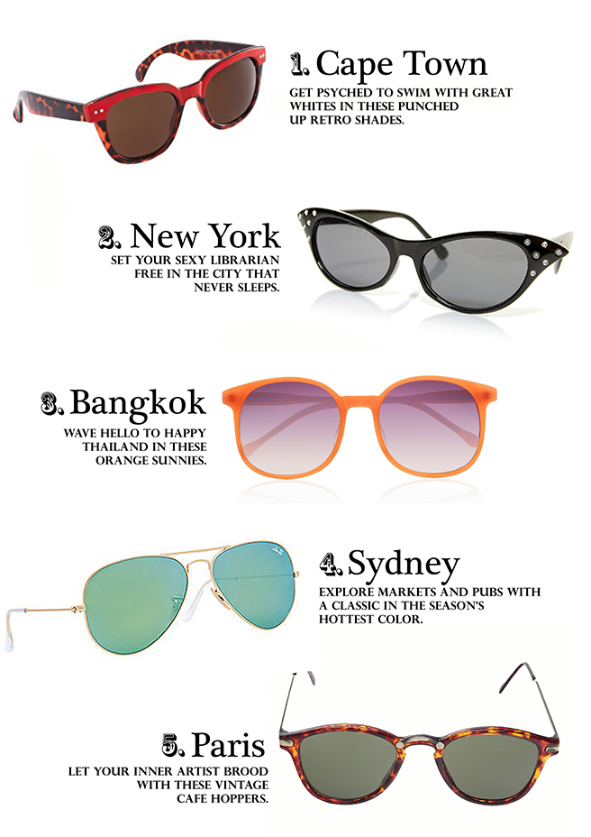 {1. ASOS New School Sunglasses – $25, 2. Black Frenchy Cateyes – $12, 3. Linda Farrow from The Outnet – $135, 4. Lord & Taylor’s Gold & Green Aviators – $195, 5. Vintage Artist by JackThreads – $24. All photos from respective websites.}