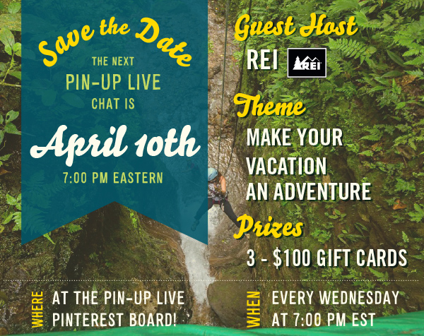 We have got an awesome Pin Up Live happening this week! REI (yes, the REI) will be our special guest host, and they’re doing it in style by offering up $100 gift cards to three lucky participants, a Pin Up Live first.