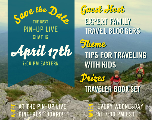 Join us this Wednesday (4/17) at 7 p.m. (EST) to have a real time chat about Tips for Traveling with Kids with a healthy dose of Pinspiration! It’s simple to participate on Wednesday, just head on over to our Pinterest board, Pin Up Live, which is dedicated to the event. We will be pinning inspirational travel pins to the board, each one containing a question related to packing. All you have to do is join in on the conversation!