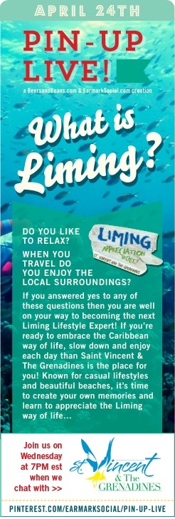 Join us this Wednesday (4/24) at 7 p.m. (EST) to have a real time chat about liming at St. Vincent & The Grenadines (SVG) with a healthy dose of Pinspiration! It’s simple to participate on Wednesday, just head on over to our Pinterest board, Pin Up Live, which is dedicated to the event. We will be pinning inspirational travel pins to the board, each one containing a question related to packing. All you have to do is join in on the conversation!