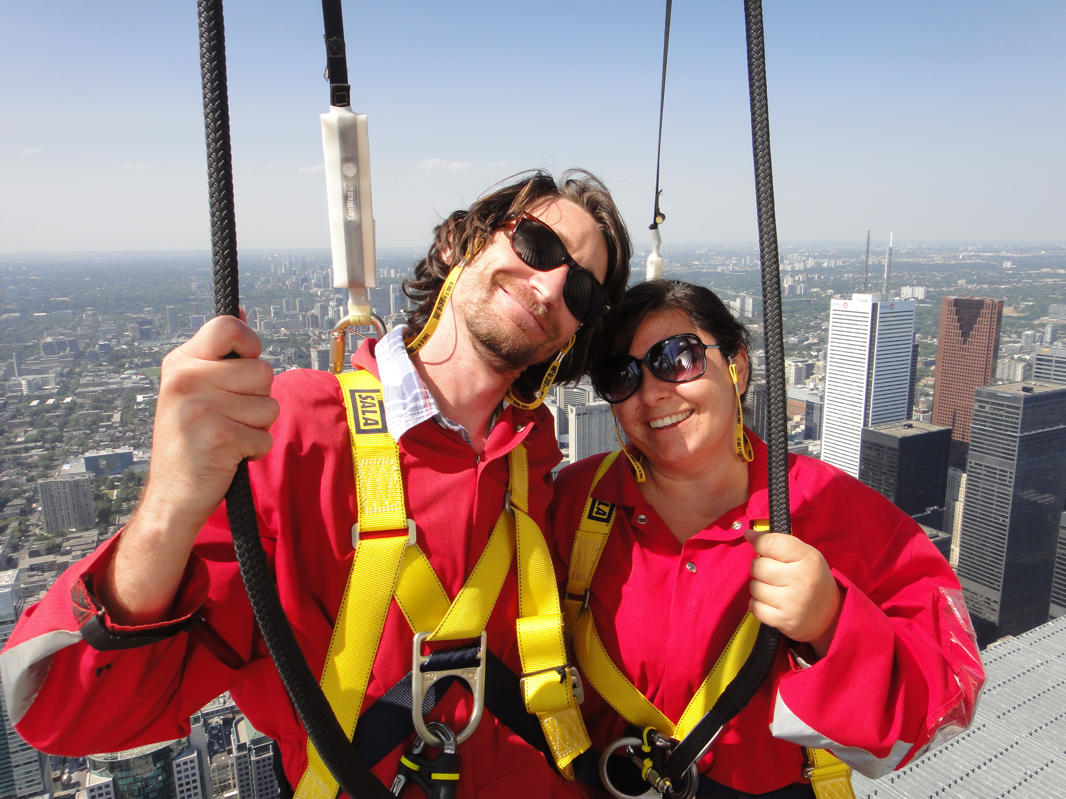 After a few minutes, Beth and I were locked into the edge walk’s overhead safety rail via a trolley and harness system and got acquainted quickly with the two lines that would be our best friends for the next 25 minutes. Following a few more minutes of safety checks—the CN Tower Edge Walk is by far the safest thrill experience that I’ve ever been part of—the door to the CN Tower’s ledge opened and our party of six (including the guide) moved out on to the five foot metal ledge, putting us 116 stories over Toronto.